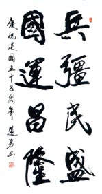 1月15日,一位佩着空军大校军衔的中年军人向“中华慈善总会”捐赠了他精心创作的300幅书法作品,其中多半是他历年来参加全国性大型书法展的精品。一时间,这种义举感动了海内外的人。这位空军大校就是中国书法家协会会员、世界华人华侨社团联合总会艺术委员会副秘书长、北京兴华艺林书画院副院长、著名军旅书法家赵勇。